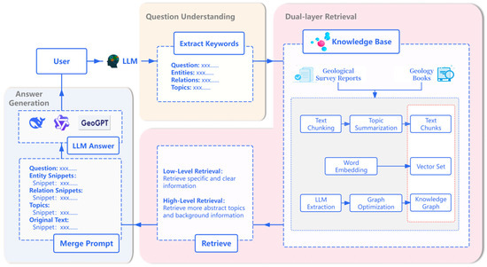 To illustrate this core retrieval process, consider the user query, “In which strata are the fluorite deposits of southeastern Chongqing primarily hosted?” as an example. The key to parsing this query lies in differentiating the semantic roles of its keywords: low-level keywords are used to locate known, specific entities within the query, serving as “anchors” for retrieval; in contrast, high-level keywords define the category of the unknown information being sought and the relationship patterns between entities, acting as a “query template.” In this query, the system extracts the low-level keywords [“Fluorite,” “southeastern Chongqing”] and the high-level keywords [“deposits,” “hosted in,” “strata”].