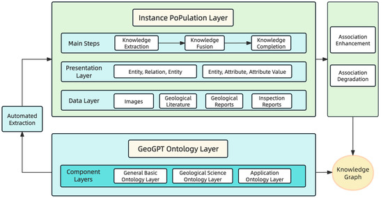 The ontology layer of the mineral prospecting knowledge graph follows a bottom-up design, comprising three primary tiers: a General Basic Ontology Layer, a Geological Science Ontology Layer, and an Application Ontology Layer. In this study, the GeoGPT model is employed to autonomously extract knowledge from authoritative sources, including geological dictionaries, Chinese geological thesauri, and literature on ore deposit science. To ensure the ontological integrity and quality, this automated process is subsequently subjected to rigorous expert-driven evaluation and refinement.
