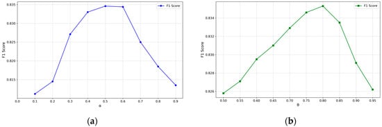 To optimize the performance of the proposed association enhancement method, we systematically tuned its key hyperparameters: the association strength weight, , and the association threshold, . A subset of the geological dataset was reserved for validation, and a grid search-based sensitivity analysis was conducted for both hyperparameters using the F1-score as the primary performance metric.
