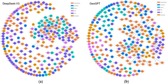 Figure 6 more clearly reveals that the graph structure constructed by DeepSeek-V3 is loosely structured, exhibiting a “hub-and-spoke” pattern. A large number of nodes are connected only to a few core entities, and the graph lacks lateral cross-connections between nodes. This exposes the limitations of the general-purpose model in knowledge extraction: namely, while it can identify key entities within the text, its lack of geological background knowledge prevents it from comprehending the complex intrinsic relationships between these entities. Consequently, it can only establish the most direct and superficial associations, resulting in a fragmented graph topology. In contrast, the GeoGPT-constructed graph demonstrated a more sophisticated and refined mesh-like topology. Its nodes were labeled with greater geological specificity (e.g., “Lower Ordovician Fenxiang Formation”), and it exhibited a superior capability to establish meaningful connections, such as linking “fluorite” to its chemical formula “CaF