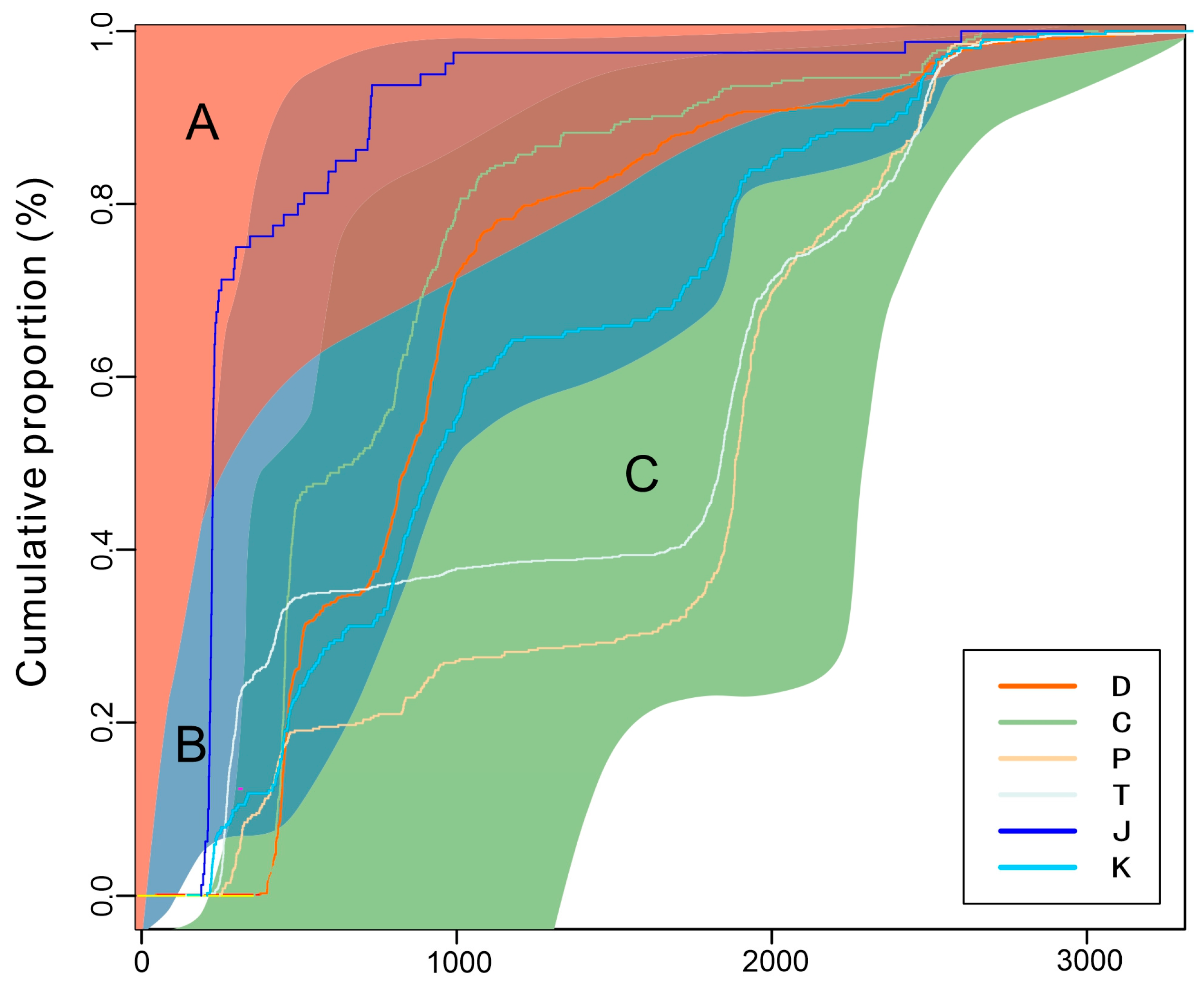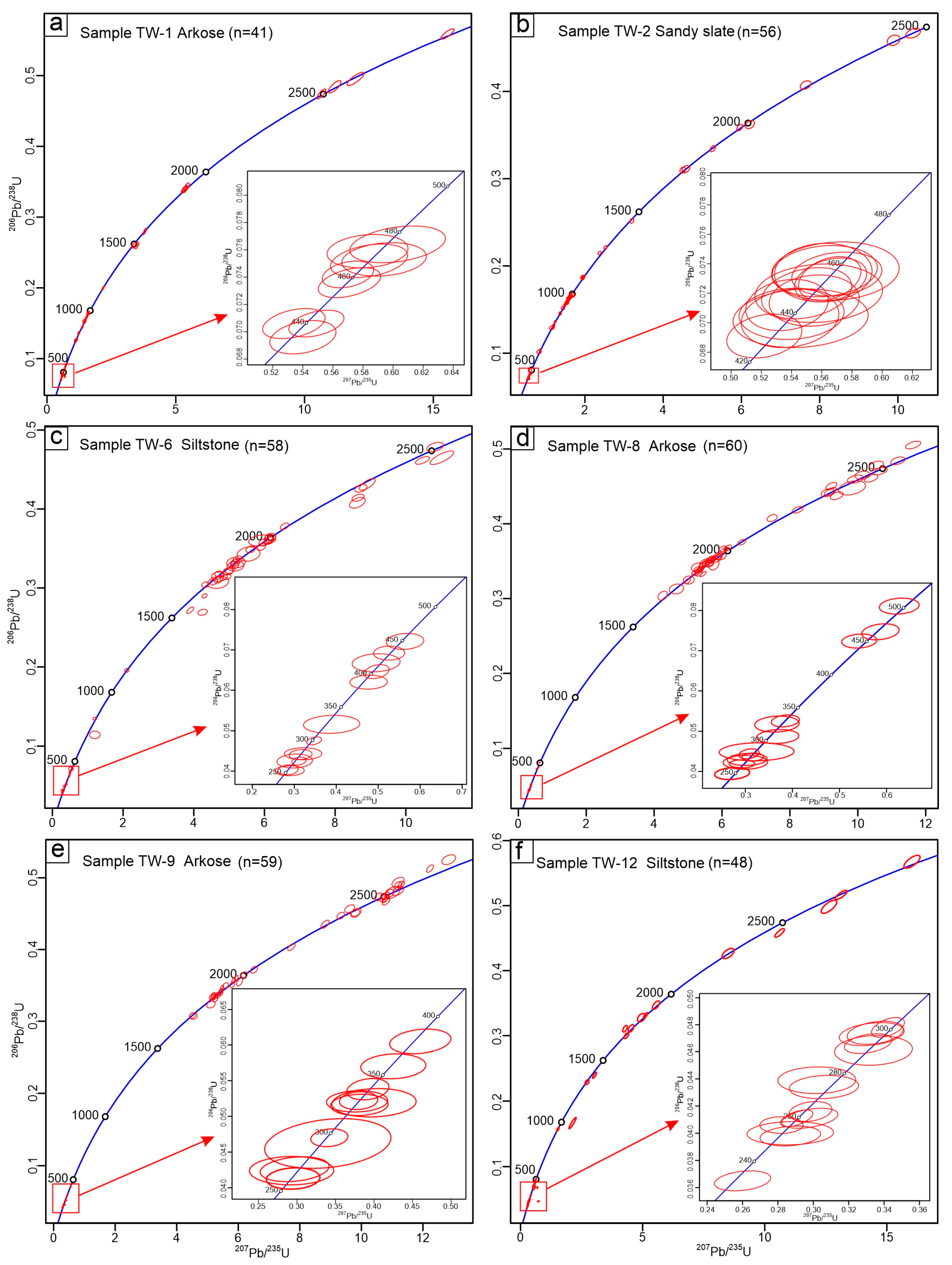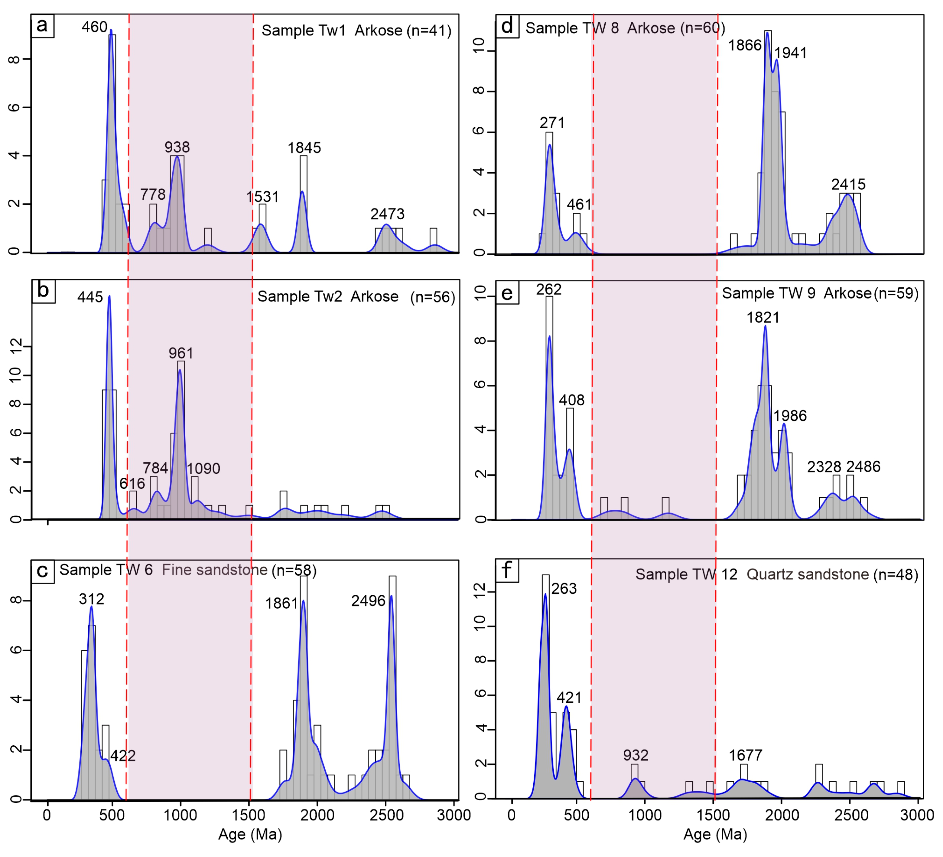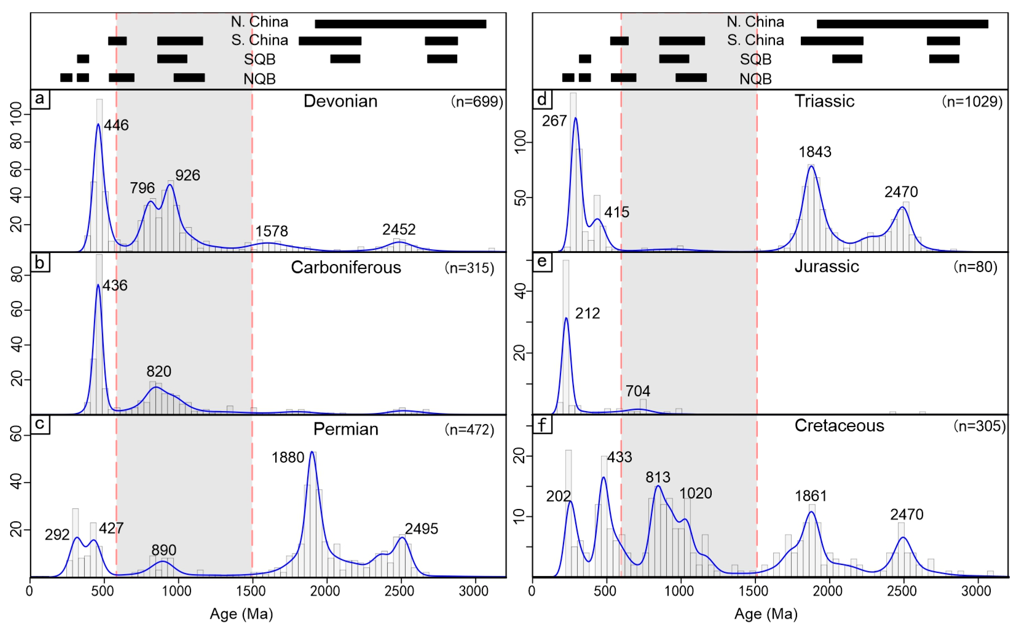 - The Devonian–Carboniferous strata in the WQOB are dominated by Neoproterozoic (~800–900 Ma) zircon populations, whereas the Permian–Triassic strata exhibit prominent Paleoproterozoic (1840–1880 Ma) and Archean (2450–2500 Ma) age peaks.