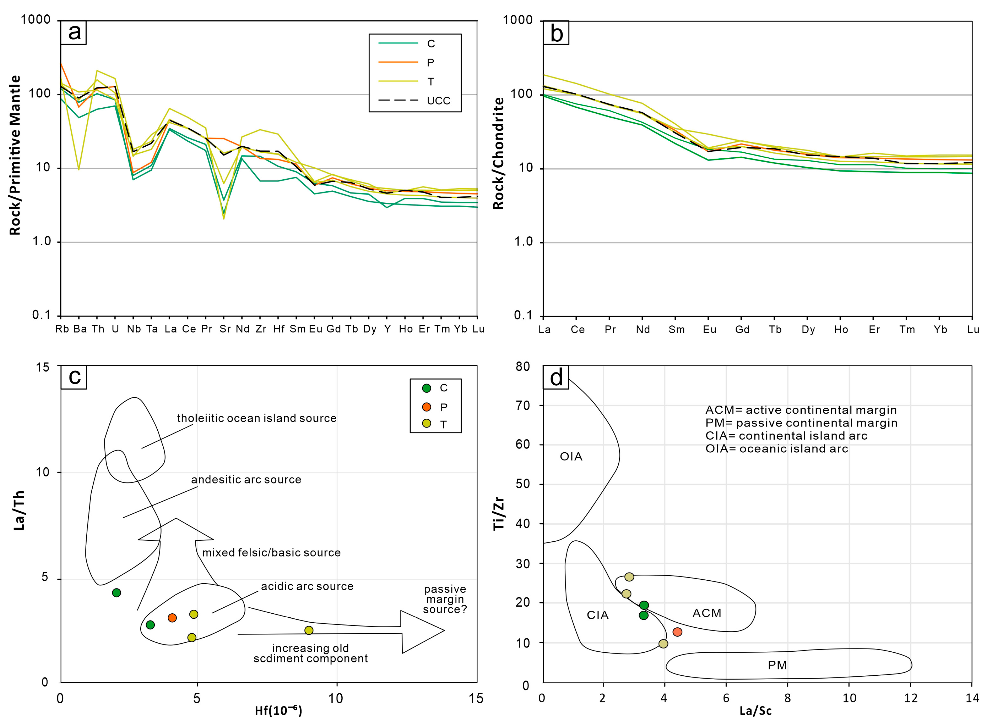 - The clastic rocks from the Devonian to Triassic periods in the WQOB show geochemical signatures that are comparable to the composition of the upper continental crust. This suggests that they formed in a continental island arc and active continental margin setting.