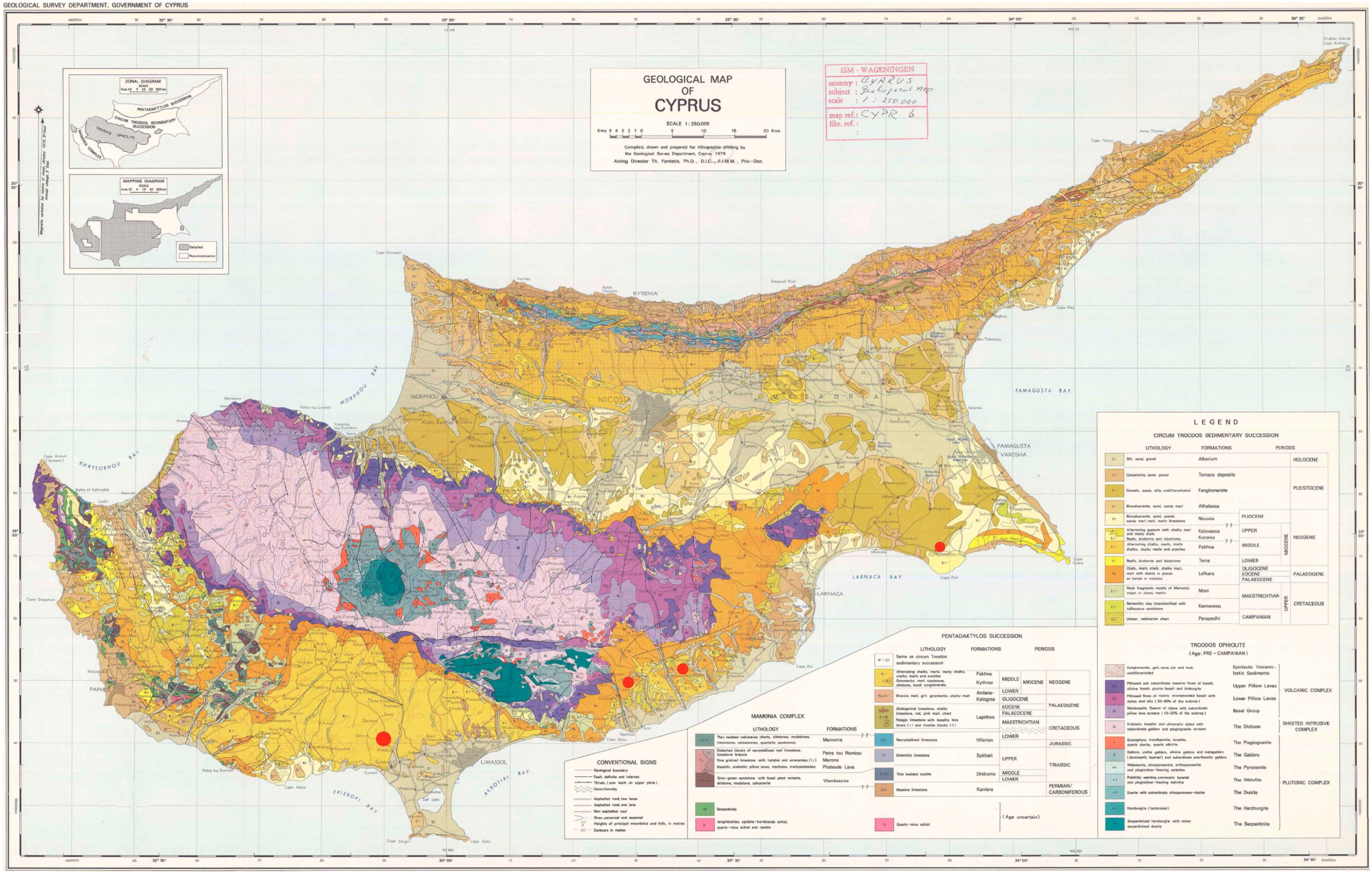 Figure 2. The geological settings of Kantou, Tochni, Agios Theodoros, and Xylophagou villages were shaped by Troodos Ophiolite, the Mamonia Complex, and Messaoria Basin formations, respectively [