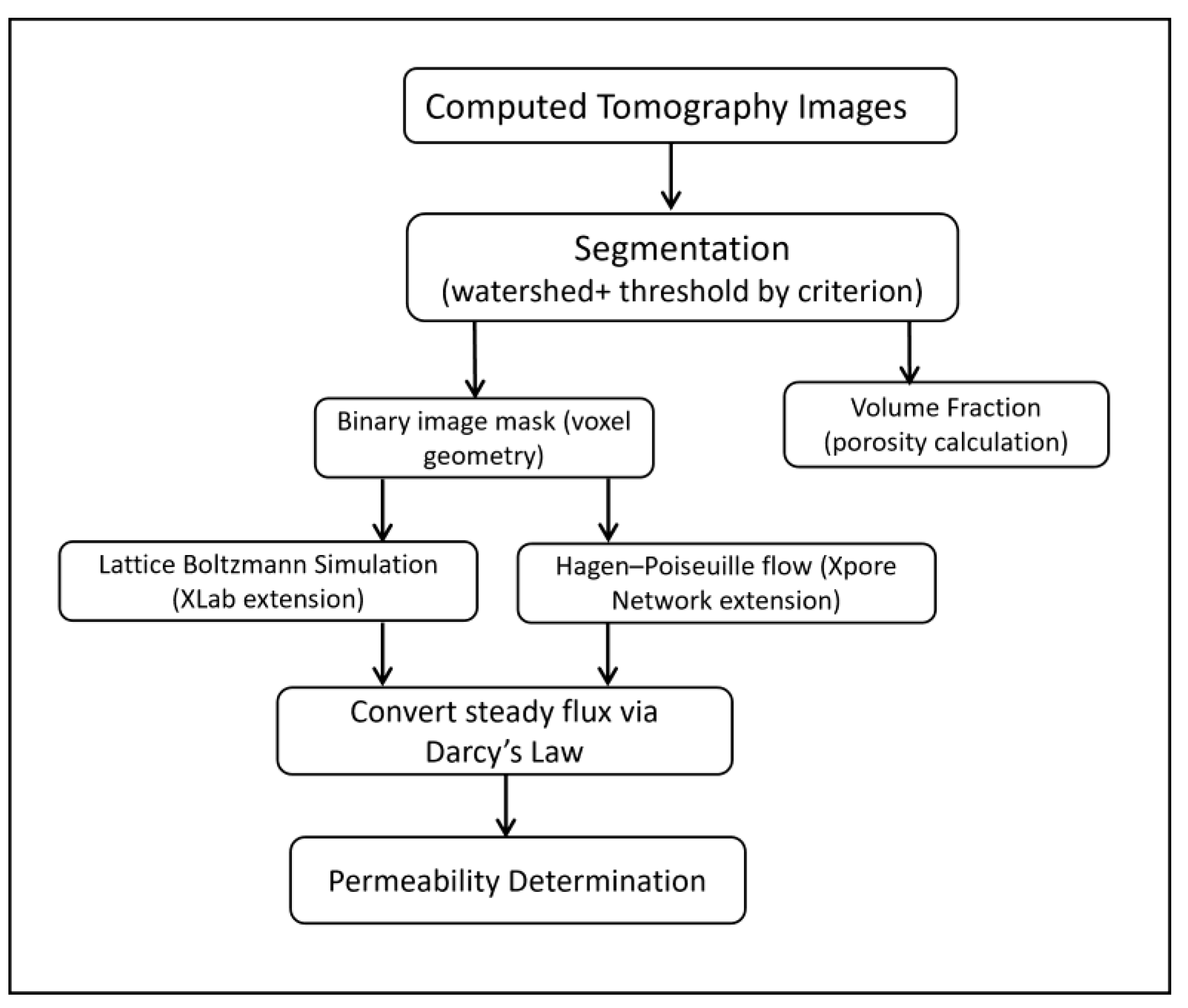 27], Avizo’s pore-network module estimates throat conductance using the Hagen–Poiseuille relation. In our study, permeability was computed from the CT-segmented voxel geometry using two independent approaches under single-phase, incompressible, low-Re conditions (Re << 1): Continuum flow on voxels (Avizo Xlab extension) and Pore-Network Modelling (Avizo Xpore Network extension).