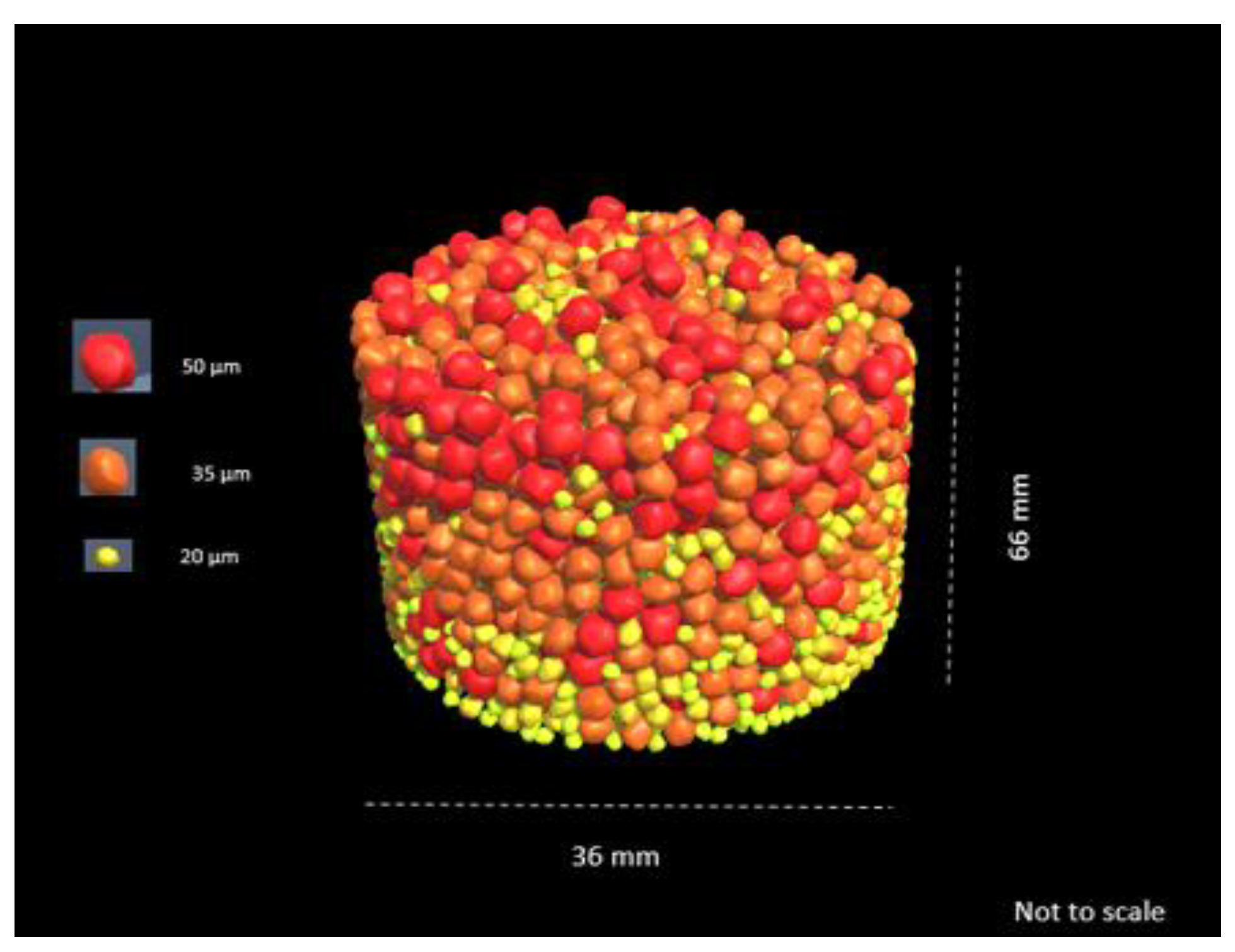 3 and with a controlled size distribution, featuring three distinct grain diameters, namely 50 μm, 35 μm, and 20 μm. All grains were deposited under the influence of gravity into a cylindrical container measuring 36 mm, in diameter, by 66 mm, in length (