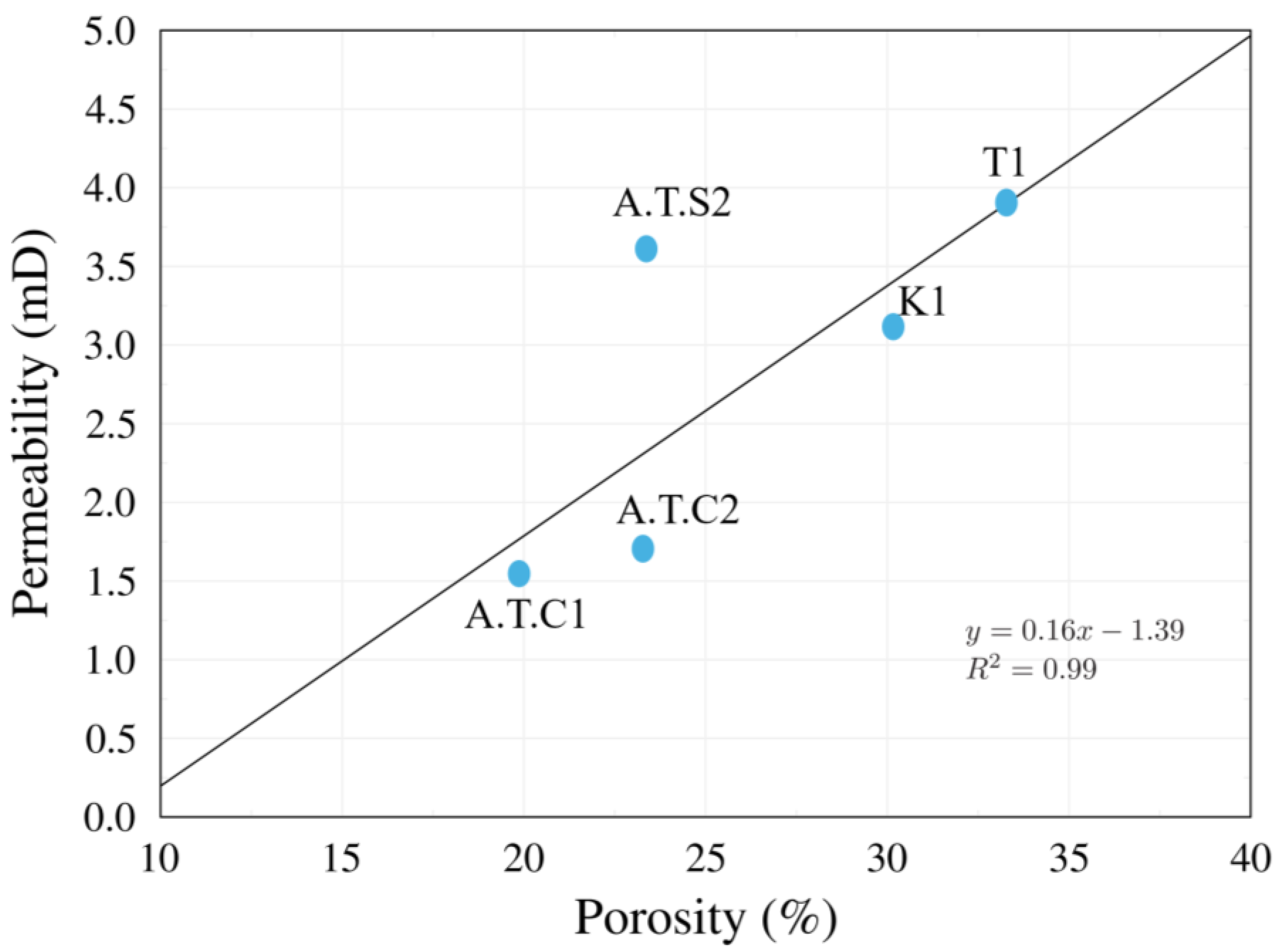 2), which amounts almost to 1, captures a perfect straight-line relationship between porosity and permeability. Sandstone samples establish a clear porosity–permeability correlation, as reflected by the gradient of the straight line, which is almost 1 and intersects the origin. There seems to be a linear relationship between these two physical rock properties. This means that an increase in porosity will be accompanied by a rise in permeability. As porosity increases from 0% to 35%, permeability grows from 0 mD to 3.34 mD. This relation is valid for all scanned natural sandstone cores. For example, the A.T.S2 core possesses a porosity (ϕ) of 24.6%, while T1 exhibits a higher porosity of 33.9%. Likewise, the permeabilities for A.T.S2 amounted to 3.57 mD while T1 boasts an even higher permeability of 3.87 mD. Apparently, the homogenous nature of the sandstone cores explains their porosity–permeability correlation. However, caution should be exercised when interpreting these results as the cohort of core samples tested is rather limited. Thus, to draw more concrete conclusions the investigation needs to be expanded to consider a wider spectrum of samples possessing a range of permeabilities.