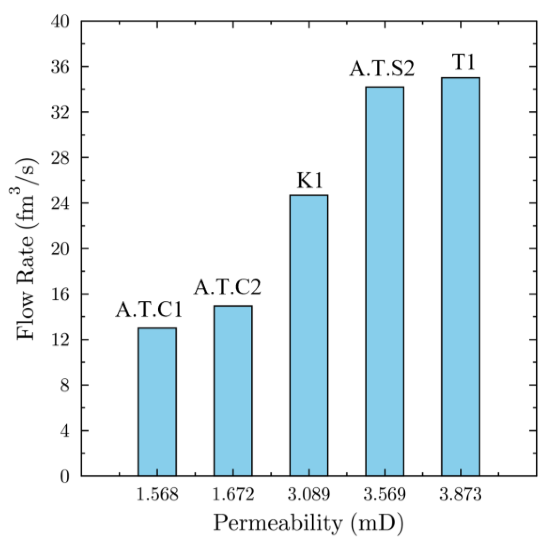 Figure 8) reveals that as permeability increases, the gas flow rate rises proportionally. More specifically, the volumetric gas flow rate almost doubled from 13 fm