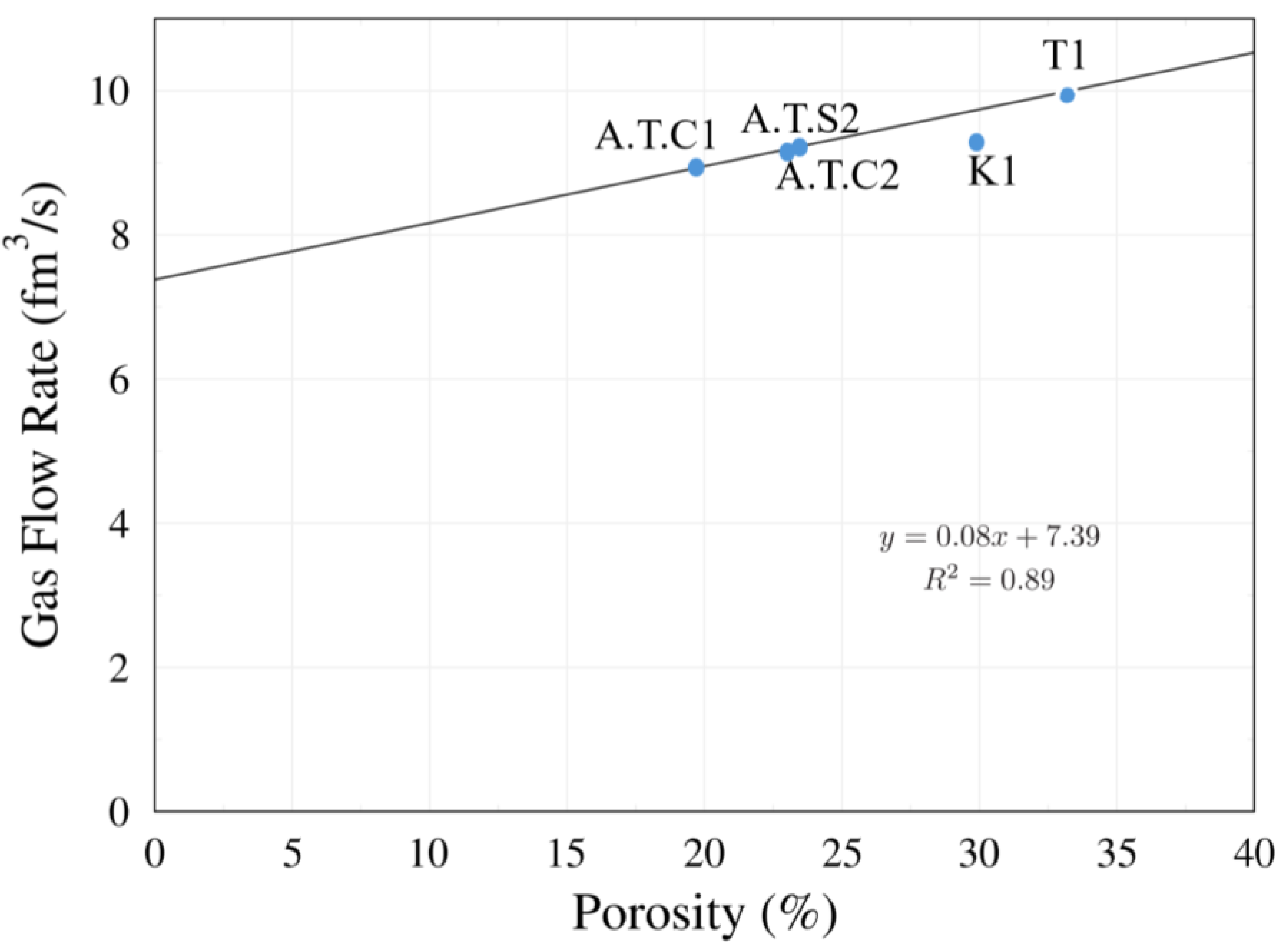 To further validate the relationship between porosity and permeability of the real sandstone cores, another parameter taken into account was the gas volumetric flow rate (in femto cubic metres per second, fm