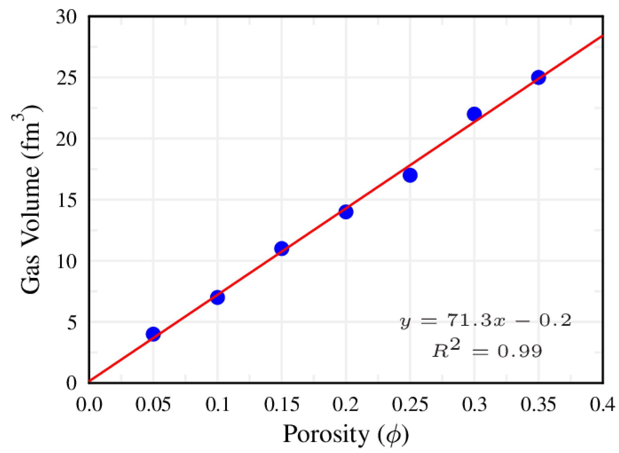 2) of almost 1 reveals a linear function (straight line fit) between the stored gas volume and the rock porosity (