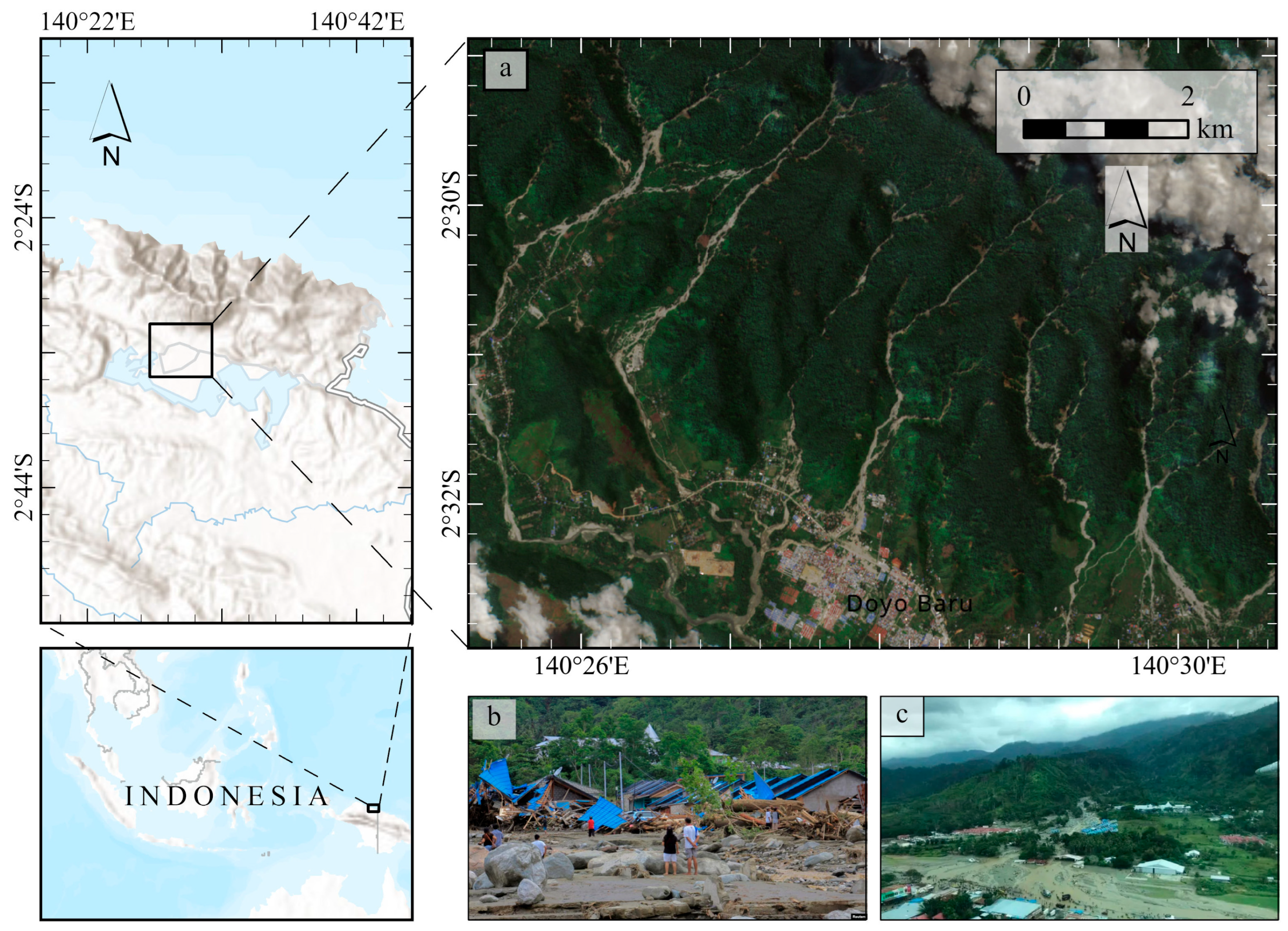 - Kompas Banjir Bandang Sentani, Tiga Tahun Berselang. Available online: https://www.kompas.id/artikel/banjir-bandang-sentani-tiga-tahun-berselang (accessed on 31 August 2025).