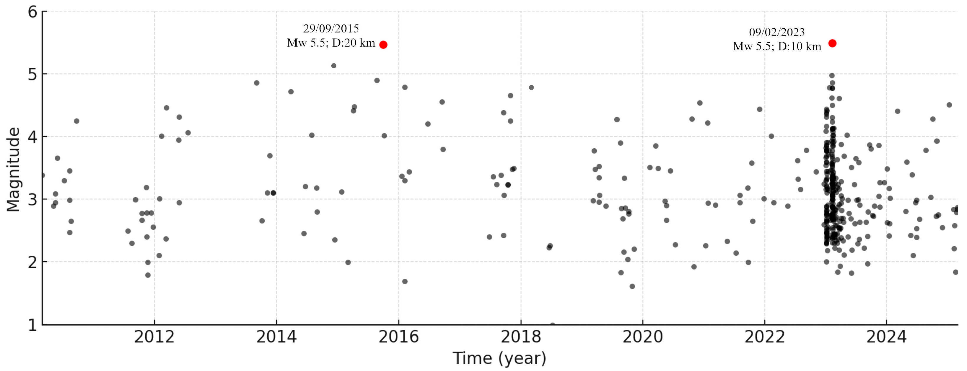 - IRIS Interactive Earthquake Browser—Global Earthquake Catalog. Available online: https://ds.iris.edu/ (accessed on 1 March 2025).