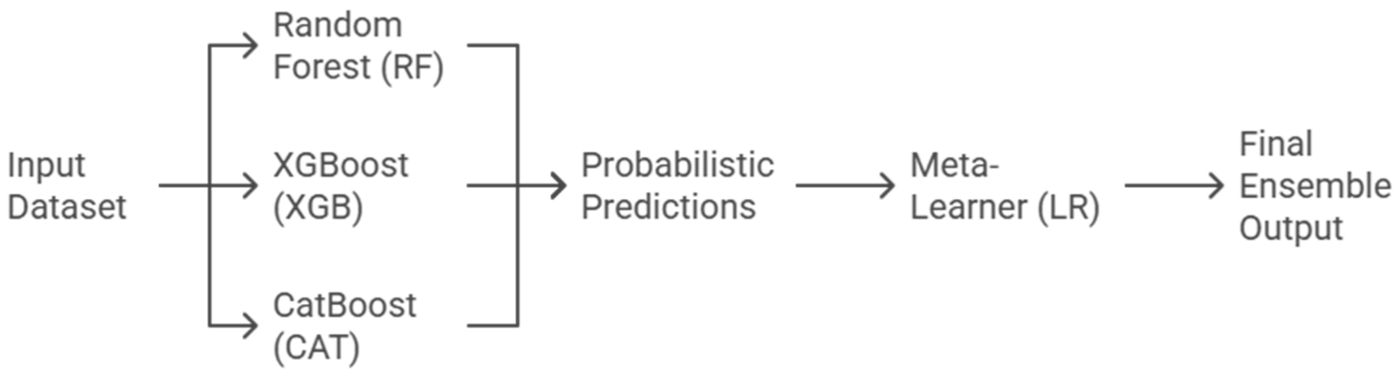 - XGBoost (Extreme Gradient Boosting)—a boosting algorithm designed for computational efficiency and accuracy, capable of modeling complex non-linear relationships. It incorporates regularization terms to further reduce overfitting [17].