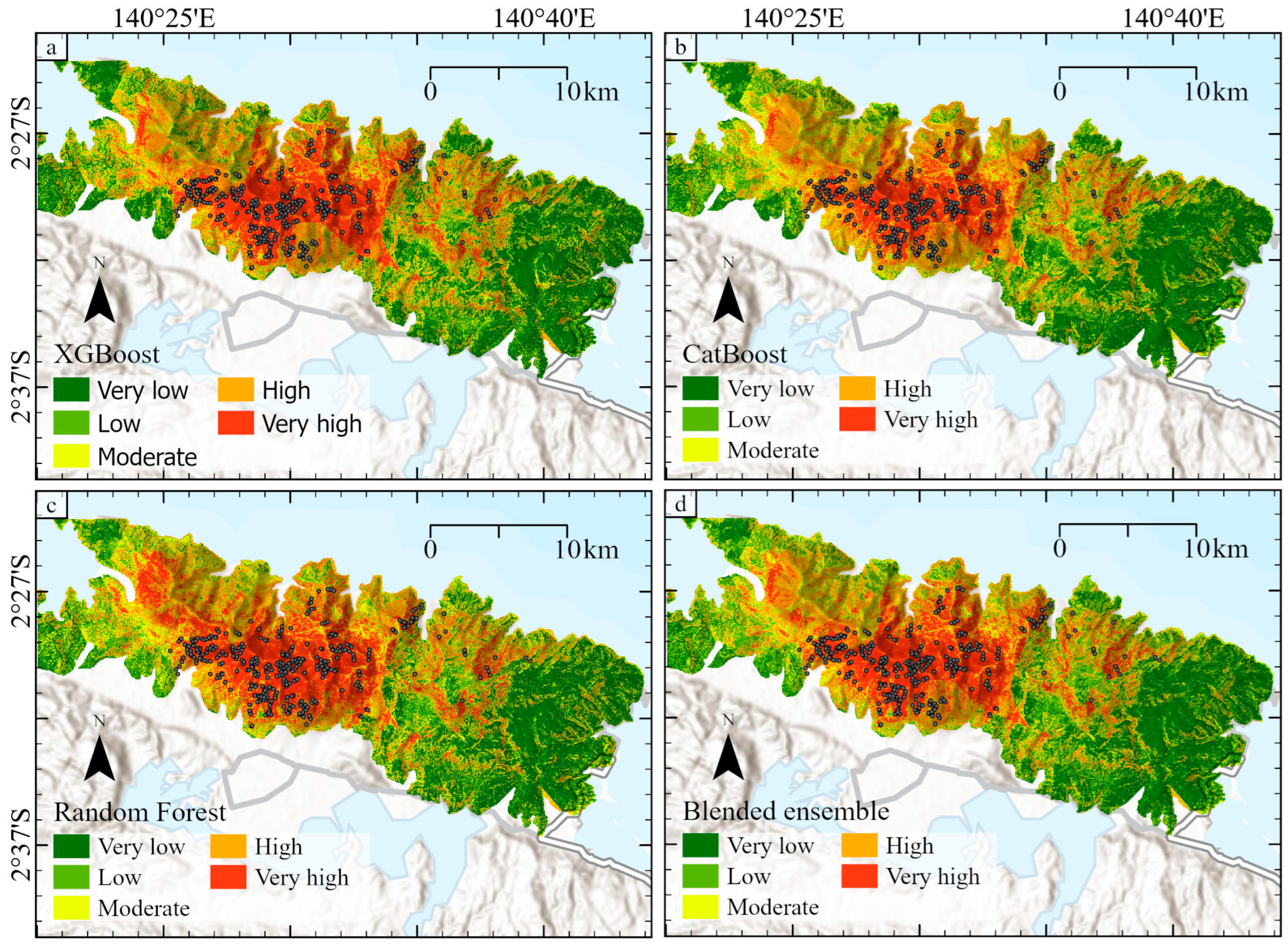 Chicago/Turabian StyleZulfahmi, Zulfahmi, Moch Hilmi Zaenal Putra, Dwi Sarah, Adrin Tohari, Nendaryono Madiutomo, Priyo Hartanto, and Retno Damayanti. 2025. "GIS-Based Landslide Susceptibility Mapping with a Blended Ensemble Model and Key Influencing Factors in Sentani, Papua, Indonesia" Geosciences 15, no. 10: 390. https://doi.org/10.3390/geosciences15100390