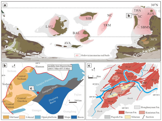 Ordovician marine red beds (OMRBs) are a distinctive type of limestone-dominated MRB [30]. They have been documented in China, Thailand, Morocco, India, and the Baltic region [28,31,32,33] (Figure 1a) and are geologically associated with the margins of Gondwana [34,35]. These OMRBs are characterized by high argillaceous and ferruginous content [27]. Nevertheless, comparative studies of OMRBs remain limited [25]. Significant variations are observed between different geological units in sedimentary characteristics, timing, and preservation form [25,26,28,33,36,37].