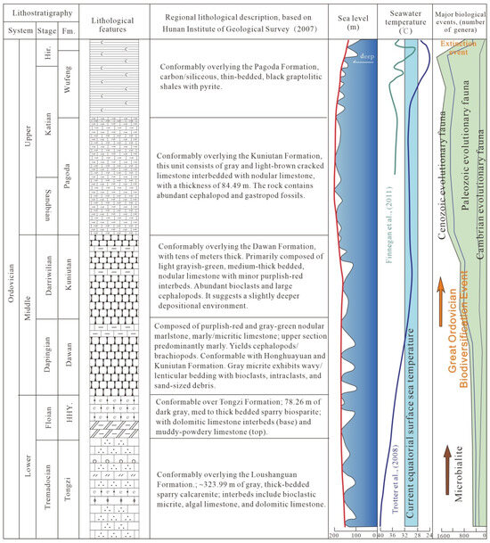 - Zhan, R.B.; Jin, J.S.; Liu, J.B.; Corcoran, P.; Luan, X.C.; Wei, X. Meganodular limestone of the Pagoda Formation: A time-specific carbonate facies in the Upper Ordovician of South China. Palaeogeogr. Palaeoclimatol. Palaeoecol. 2016, 448, 349–362. [Google Scholar] [CrossRef]