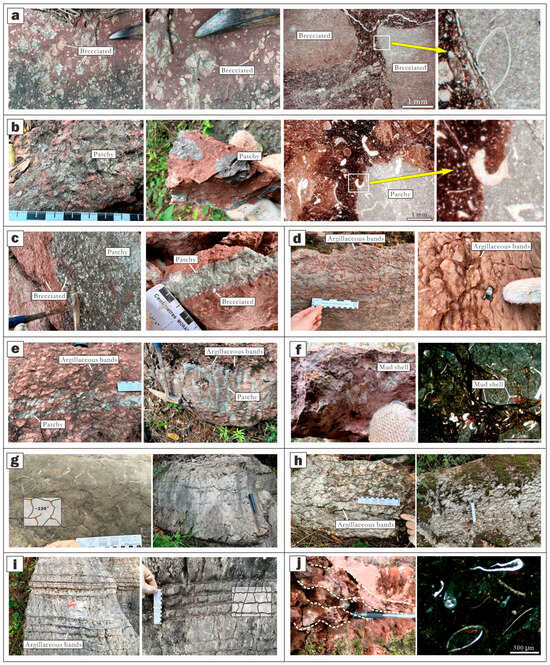 Interpretation: This type exhibits relatively homogeneous lithology with high overall argillaceous content, a distinctly red color, and a turbid matrix that obscures the argillaceous bands (Figure 3j). The matrix forms somewhat rounded bodies approximately 5 cm in diameter. Macroscopically, these aligned bodies show a preferred orientation, resembling arranged “lenses”—a characteristic that becomes more evident upon physical breakage. The rock is exceptionally hard. Microscopic observation reveals abundant ferruginous and argillaceous material, with few fossils present.