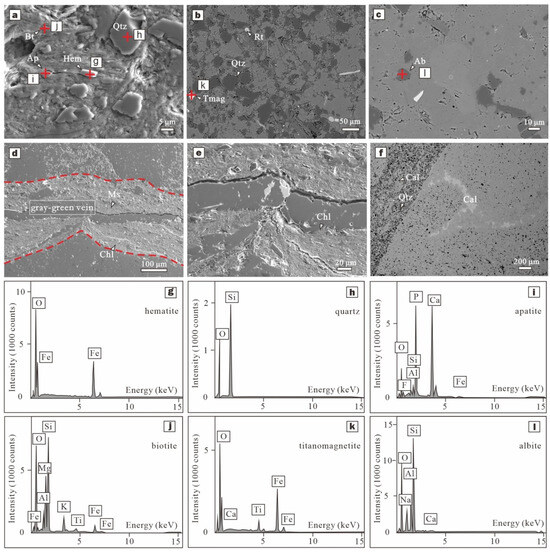 SEM images and EDS analyses of OMRBs in Sanbaidong section. (a–c), The main metallic minerals in the Dawan Formation of Xiangxi, such as hematite, rutile, and titanomagnetite. Among them, hematite has a coloration effect. (d,e), The chlorite vein of the Kuniutan Formation. (f) Argillaceous bands of the Kuniutan Formation. (g), The EDS of hematite. (h), The EDS of quartz. (i), The EDS of apatite. (j), The EDS of biotite. (k), The EDS of titanomagnetite. (l), The EDS of albite.