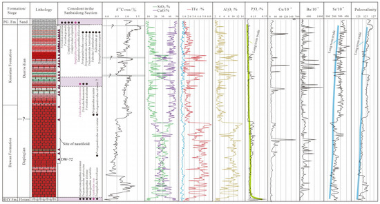 In the Sanbaidong section, iron and aluminum contents show a strong positive correlation (R2 = 0.953) (Figure 7). Marine carbonates typically contain little inherent aluminum, which is primarily derived from terrigenous sources [79,80]. Although the depositional environment of the OMRBs in South China is debated, being interpreted as either shallow-water [69,81] or deep-water [12,82], the lower part of the Dawan Formation in the Sanbaidong section exhibits high concentrations of TFe and terrigenous elements like aluminum (Figure 5). Grayish-green and grayish-white interbeds in the middle-upper parts of the sequence mostly occur in layers with low aluminum content. Nutrient elements such as P and Cu are typically low in normal surface seawater. In the lower red beds, however, low salinity and a limited biological presence [27] resulted in reduced consumption of these elements by biological processes. Consequently, their concentrations are high in the lower part of the section and decrease upward (Figure 5). This trend contrasts with the correlation observed for the scavenged elements. Paleosalinity shows a strong positive correlation with Sr and a negative correlation with Al (Figure 5). Therefore, elemental analysis suggests a shallow-water origin for the red carbonates in the Sanbaidong section, an interpretation that will be further explored below from the perspective of sedimentary structures.