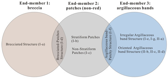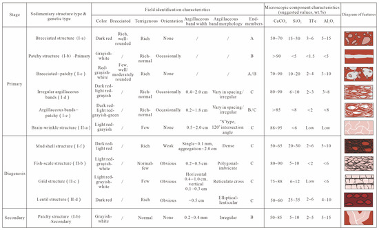 Each sedimentary structure is theoretically underlain by a unique genetic mechanism. This study analyzes the principal factors controlling the ten sedimentary structures, focusing on color, breccias, and argillaceous bands (Figure 6). These factors are categorized into three genetic end-members: breccias, patches (non-red components), and argillaceous bands. Since color is a ubiquitous characteristic of all marine red beds, it is discussed first.