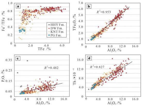 Correlation of key elements of OMRBs in Sanbaidong section. (a), The iron components of red beds (Dawan Formation and Kuniutan Formation) and non-red beds (Honghuayuan Formation and Pagoda Formation). (b), The correlation of Total Fe and Al2O3. (c), The correlation of nutrients P2O5 and Al2O3. (d), The correlation of scavenged elements Th and Al2O3.