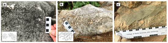 Interpretation: This type exhibits a macroscopic morphology resembling “fish scales.” The ridges are notably protruding on the weathering surface, are relatively narrow, measuring approximately 0.2~0.5 cm in width (Figure 3h). The enclosed matrix consists of bioclastic micritic limestone, forming shapes transitioning from hexagonal to elliptical. These units are relatively uniform in size, occur in clusters, and display a distinct preferred orientation.