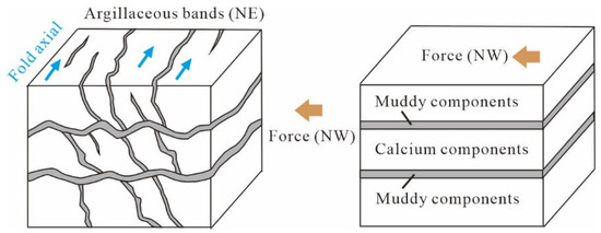 This study contends that this type differs significantly from the argillaceous banding described above, both macroscopically and microscopically. The observed mineral orientation likely indicates the influence of stress, justifying its classification as a distinct subtype termed mud shell structure.
