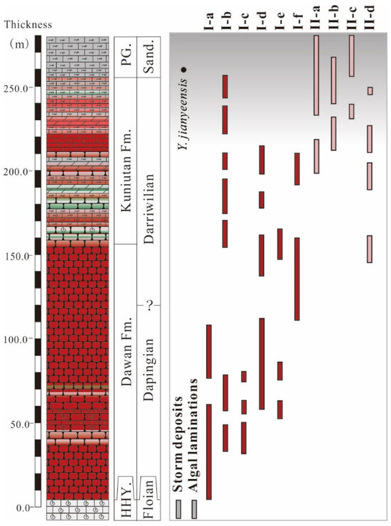 This study follows the lithostratigraphic scheme from the Dayong City regional geological survey report [61], which treats the Kuniutan and Pagoda Formations as being in direct contact (Figure 2). At the Sanbaidong section, the Dawan Formation is approximately 153 m thick, and the Kuniutan Formation is about 101 m thick. Based on conodont fossils, the red beds at the Sanbaidong section are from Oepikodus evae zone to Yangtzeplacognathus jianyeensis zone [27].