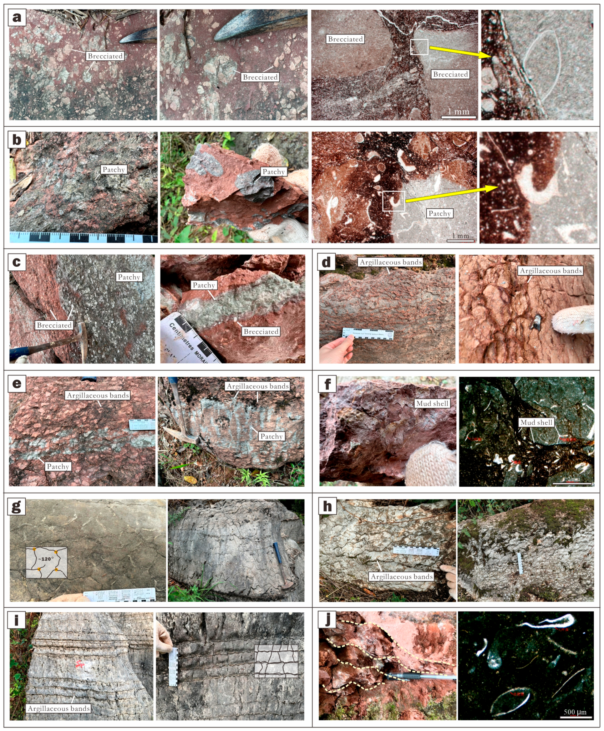 - The genesis of these structures is elucidated through the three end-members. The breccia end-member indicates deposition in a shallow-water, high-energy environment. The patch end-member reflects control by syndepositional redox conditions and the later influence of reducing fluids. The argillaceous bands have a dual origin, forming either under primary depositional conditions or from syndepositional compressive stress.