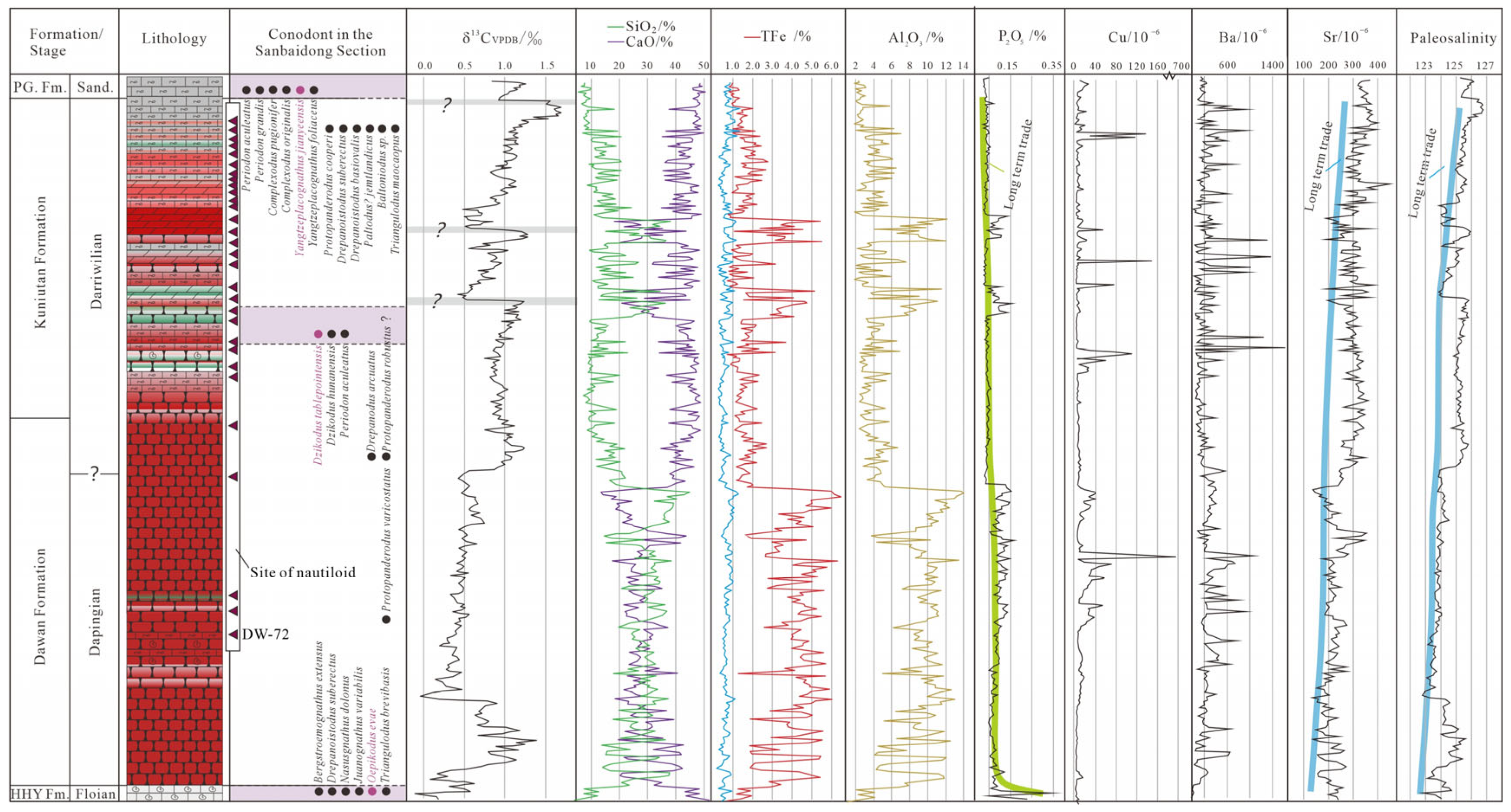 Hunan, Sanbaidong | Dawan Formation | Nodular limestone, etc. | 471.3~469.4 conodont fossils) | ~80.5 | |