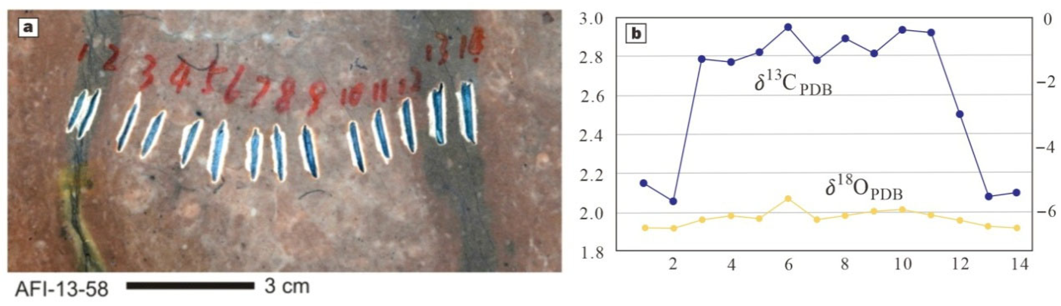 - Van Der Kooij, B.; Immenhauser, A.; Steuber, T.; Hagmaier, M.; Bahamonde, J.R.; Samankassou, E.; Tomé, O.M. Marine red staining of a Pennsylvanian carbonate slope: Environmental and oceanographic significance. J. Sediment. Res. 2007, 77, 1026–1045. [Google Scholar] [CrossRef]