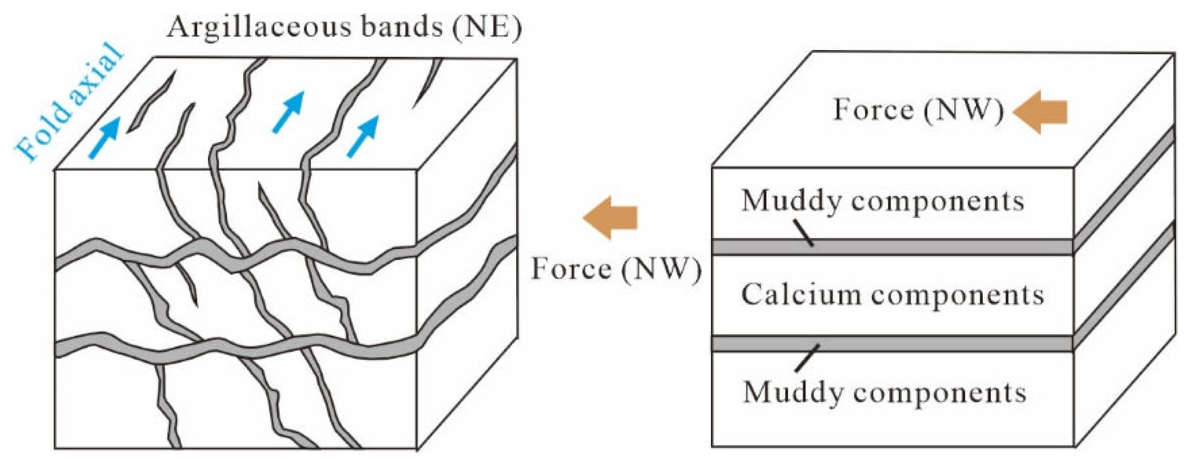 - The development of vertically penetrating argillaceous bands was controlled by syndepositional compressive stress, likely related to NW-directed compression during the early stages of the Kwangsian Orogeny.