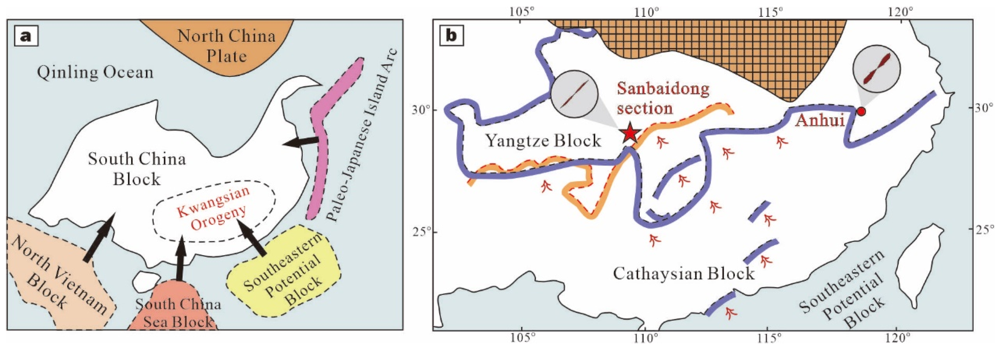 - Wang, X.; Gao, X.F.; Zha, X.F. Tectonic response of the Kwangsian Orogeny in the northern margin of the South China Block: Evidences from biostratigraphy. Earth Sci. 2024, 49, 3199–3211. [Google Scholar]