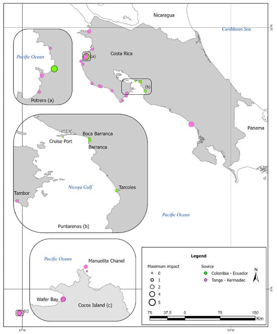 Locations where tsunamis from Tonga–Kermadec (pink circles) and Colombia–Ecuador (green circles) subduction zones were recorded in Costa Rica. The number represents the maximum impact of the tsunami (0, instrumental record; 1, sea level changes; 2, strong currents; 3, flooding; 4, damages by currents; and 5, damages by flooding) according to the impact scale defined in [8].
