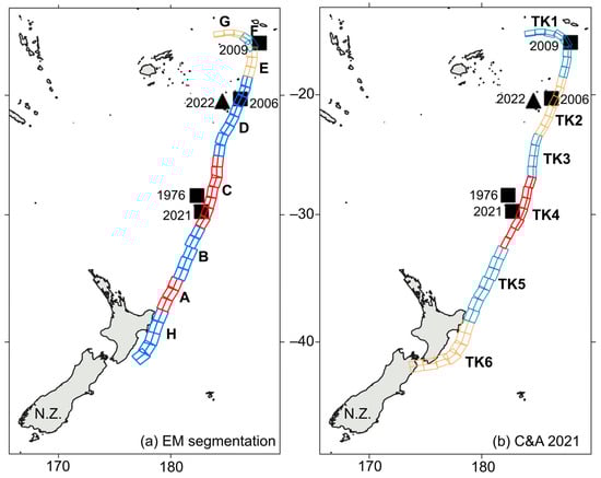 Comparison of fault planes along the Tonga–Kermadec subduction zone employed for (a) the scenarios modeled in this work and (b) the scenarios modeled in [1]. Some scenarios modeled here are a combination of single scenarios in (a). The scenario with the maximum tsunami wave heights is shown in red and blue in (a) ETK21 (H + A + B + C + D) and in red in (b) TK4. Epicenters of earthquakes causing tsunamis recorded in Costa Rica are shown with black squares and Hunga Tonga–Hunga Ha’apai volcano is shown with a black triangle.