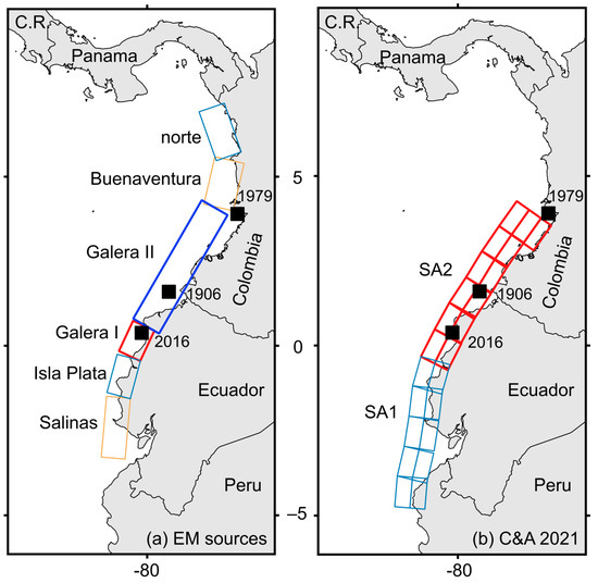 Comparison of fault planes along the Colombia–Ecuador subduction zone employed for (a) the scenarios modeled in this work and (b) the scenarios modeled in [1]. The scenario with the maximum tsunami wave heights is shown in red and blue in (a) ECE28 (Galera 1 + Galera 2) and in red in (b) SA2. Epicenters of earthquakes causing tsunamis recorded in Costa Rica are shown with black squares.