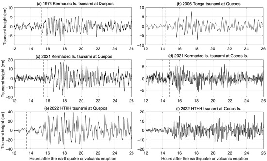 Tsunami records of the (a) 1976 Kermadec Islands tsunami and the (b) 2006 Tonga tsunami at the Quepos tide gauge, and of the 2021 Kermadec Islands tsunami at (c) the Quepos tide gauge and (d) the Coco’s Island tide gauge. Also, tsunami records of the 2022 Hunga Tonga–Hunga Ha’apai (HTHH) tsunami at (e) the Quepos tide gauge and (f) the Cocos Island tide gauge. Panel (a) presents unpublished records, panel (b) was modified from [17], panels (c,d) were modified from [9], and panels (e,f) were modified from [10].