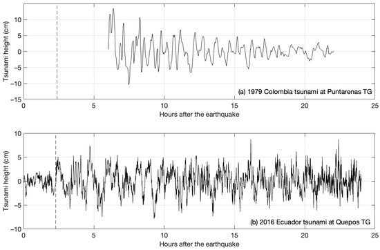 Tsunami records of the (a) 1979 Colombia tsunami at the Puntarenas tide gauge, and (b) the 2016 Ecuador tsunami at the Quepos tide gauge. Panel (a) was modified from [17]. Data in panel (b) has not been published before. Dashed line in (a) shows estimated arrival time.