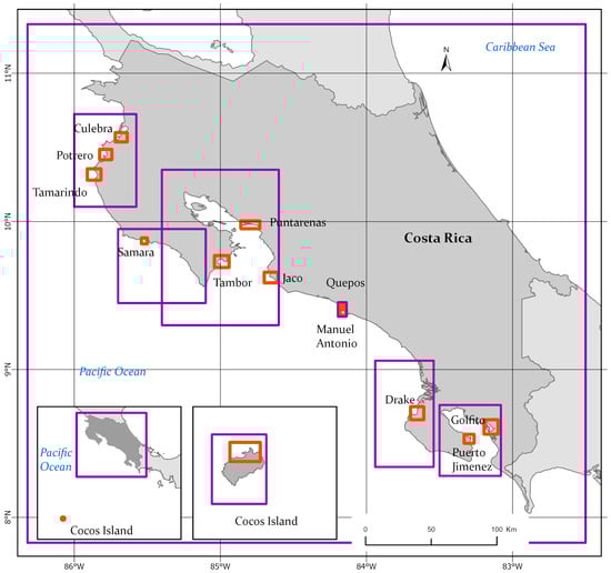Extent of the grids B (purple rectangles) and C (red rectangles) of model sites employed here for tsunami modeling. See the grids’ resolutions in Table 1.