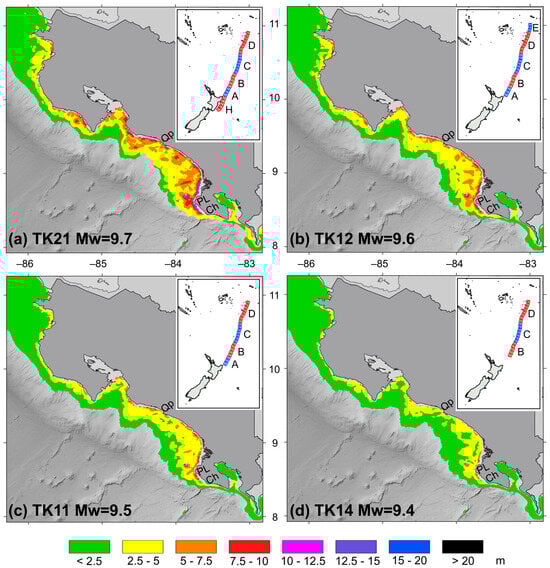 From the Tonga–Kermadec intermediate probability scenarios modeled here, two had nearshore maximum tsunami wave heights (NTHs) larger than 20 m, scenario 21 and 12 with 26.1 and 24.4 m, respectively (Table 2, Figure 7a,b). Two scenarios had maximum NTHs over 10 m, scenarios 11 and 14, with 18.3 and 14.6 m, respectively (Table 2, Figure 7c,d). The maximum NTH for high probability scenarios was 5.3 m for scenario 4, and the minimum value of maximum NTH among all the TKSZ scenarios was for scenario 7 with 0.1 m (Table 2). Scenarios from the Tonga–Kermadec subduction zone affected particularly the south Pacific coast of Costa Rica (Figure 7). The travel times obtained for the largest magnitude scenario, ETK21, were 13:31 to Cocos Island and 14:07 to the mainland.