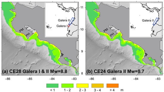 Maximum nearshore tsunami wave heights caused by Colombia–Ecuador scenarios (a) Galera I and II, and (b) Galera II. The maximum nearshore tsunami wave heights caused by the other Colombia–Ecuador scenarios are shown in the Supplementary Materials. Places shown in the figure are as follows: PM, Punta Muñeco; PH, Playa Hermosa. The colors in the figure show maximum NTH in meters.