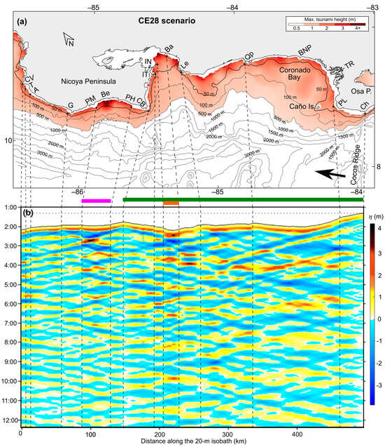 (a) Maximum heights in meters caused by the ECE28 scenario (Galera I and II). (b) Time evolution of the waves in meters for the coast section between Cabo Velas (CV) and Punta Chancha (Ch). Times are given in hours after the earthquake and the horizontal axis shows the distance along the 20 m isobath. Black arrow in (a) shows approximated wave incidence direction. Places shown in the maps are as follows: CV, Cabo Velas; T, Tamarindo; A, Avellanas; G, Garza; PM, Punta Muñeco; Be, Bejuco; PH, Playa Hermosa; CB, Cabo Blanco; IT, Tortuga Island; IN, Negritos Island; Ba, Bajamar; Le, Punta Leona; Qp, Quepos; BNP, Ballena National Park; PL, Punta Llorona; Ch, Punta Chancha. Purple and green lines show the subsections for which the tsunami waves persisted for longer times compared to neighboring subsections. The orange line shows the mouth of Nicoya Gulf, where tsunami waves lasted the longest.