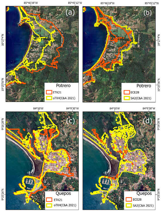 Upper panels: comparison of the inundation areas at MS3 Potrero (a) caused by scenario ETK21 (orange) and scenario TK4 of [1] (yellow), and (b) caused by scenario ECE28 (orange) and scenario SA2 of [1] (yellow). Lower panels: comparison of the inundation areas at MS9 Quepos (c) caused by scenario ETK21 (orange) and scenario TK4 of [1] (yellow), and (d) caused by scenario ECE28 (orange) and scenario SA2 of [1] (yellow).