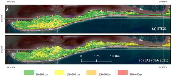 Regarding inundated areas, Tamarindo had the largest for both scenarios: 7.4 and 3.6 km2 for ETK21 and ECE28, respectively. The smallest inundated areas were for Quepos: 0.04 km2 for ECE28 and Cocos Island; 0.15 km2 for ETK21.