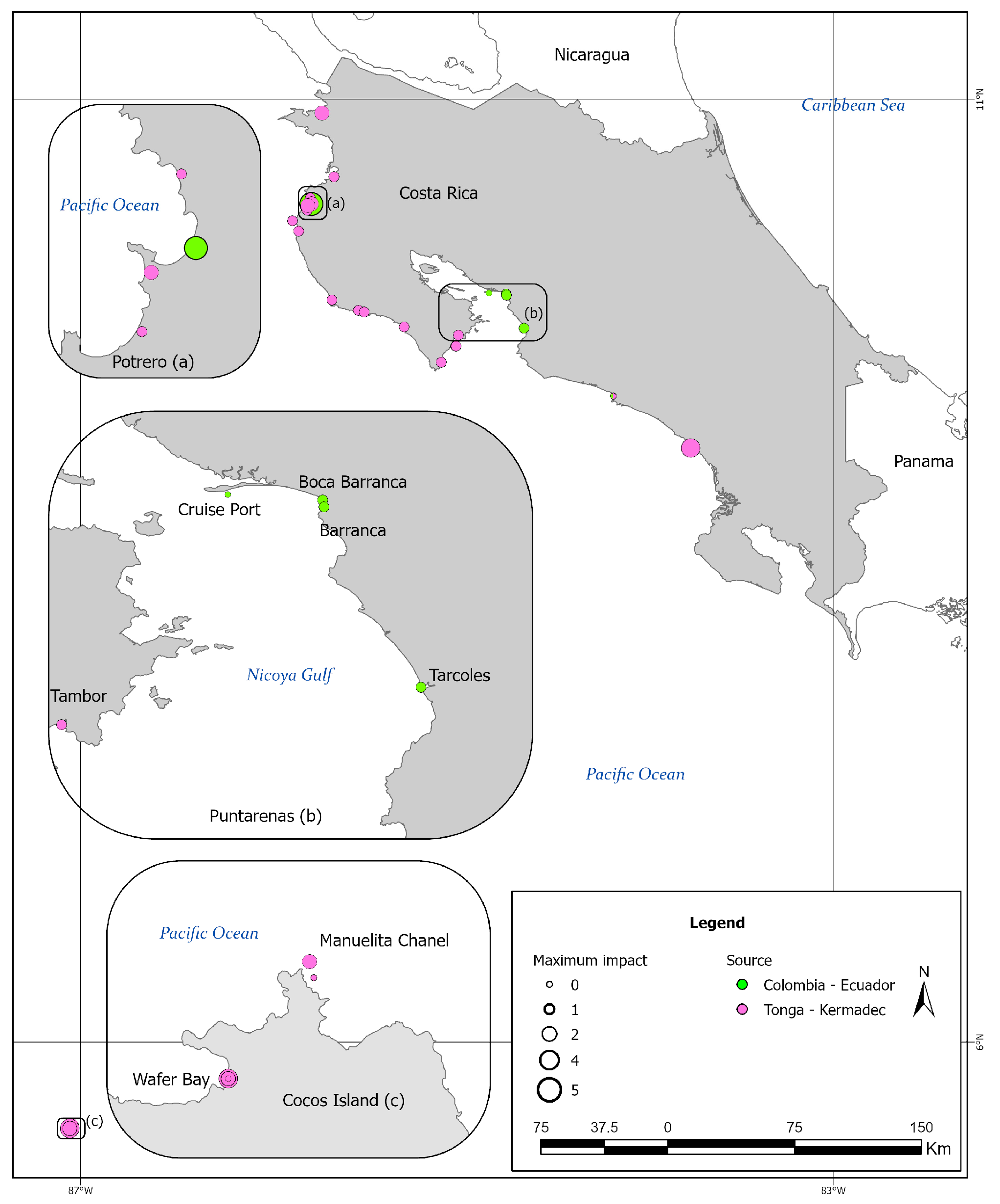 - Porras, H.; Chacón-Barrantes, S.E.; Murillo-Gutiérrez, A.; Rivera-Cerdas, F. Tsunami de Las Islas Kermadec Del 4 de Marzo Del 2021: Registros, Modelado Numérico y Atención del Evento Para Costa Rica. Rev. Cienc. Mar. Costeras 2022, 14, 31–49. [Google Scholar] [CrossRef]