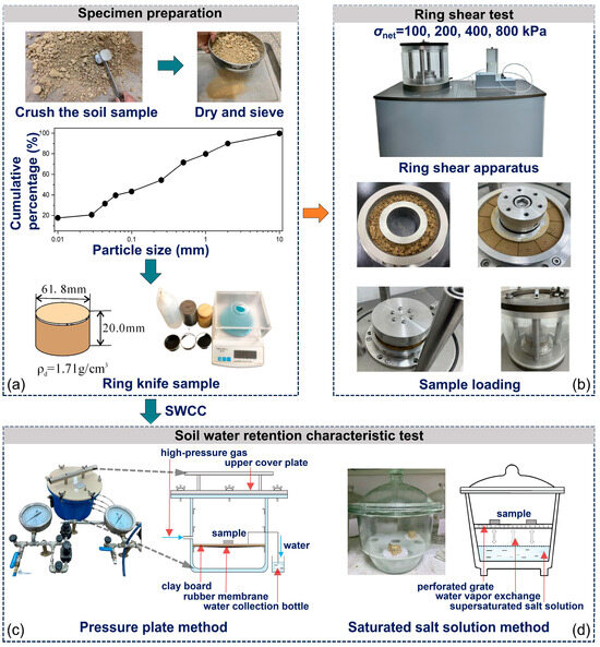 For sample preparation, soil specimens were oven-dried at 105 °C for 24 h to constant weight, crushed with a rubber hammer, and sieved through a 2 mm sieve. One portion was used for soil water characteristic testing, while the other was prepared for suction-controlled ring shear tests, with detailed procedures illustrated in Figure 2.