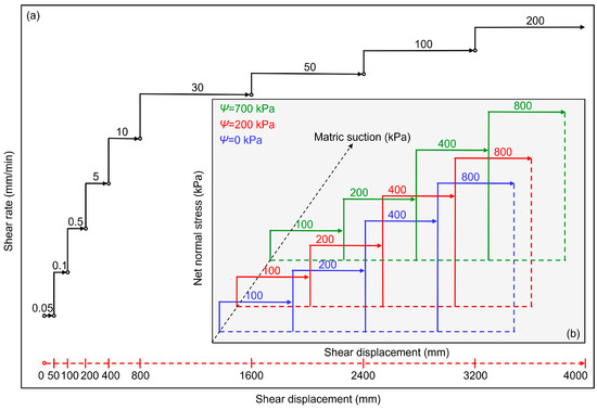 The shear testing combined pre-shearing with multi-stage shearing. During the pre-shearing phase, specimens were sheared at 0.1 mm/min for 100 mm displacement to establish a stable shear surface and eliminate initial disturbance effects. In the multi-stage shearing phase, was incrementally increased from 0.05 to 200 mm/min (0.05→0.1→0.5→5→10→30→50→100→200 mm/min) following the solid line path in Figure 4. The determination of this wide shear rate range considered instrument capability, research objectives, and the basis in the literature [8]. This comprehensive range aimed to systematically explore the evolution of residual strength throughout the entire process, from extremely slow creep (0.05 mm/min effectively captures the creep mechanical response of extremely slow landslides like loess slopes, which have annual displacements in the millimeter range) to the critical state of accelerated failure (where transient pore water pressure effects are triggered by blocked drainage at high speeds). Continuous shearing without interruption was maintained to prevent pore water pressure dissipation and specimen consolidation [37], ensuring the authenticity of dynamic sliding simulation.