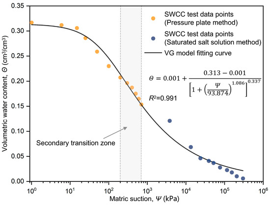 This study employed the pressure plate method (0–700 kPa) and saturated salt solution vapor equilibrium method (3–400 MPa) to obtain volumetric water content data across a wide suction range for the Huangtupo landslide slip-zone soil. As shown in Figure 5, the soil–water characteristic curve (SWCC) was established by integrating test data from both methods and fitting with the four-parameter Van Genuchten model [38]: