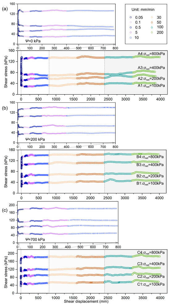 Analysis of shear stress–displacement relationships across all suction conditions reveals that all specimens underwent three distinct stages: peak strength, strain softening, and residual strength. However, the combination of high s (800 kPa) and high suction (700 kPa) can induce strain hardening. significantly influences the response. In the low-speed shear stage ( ≤ 10 mm/min, ≤800 mm displacement), there is rapid stress decay with early formation of residual strength platforms, enhancing strain softening behavior. In the medium-speed shear stage (10–50 mm/min, 800–2400 mm displacement), larger displacement is required to reach a stable state, likely due to differences in particle reorientation and pore water pressure dissipation timing [13]. In the high-speed shear stage ( > 50 mm/min, >2400 mm displacement), increased curve fluctuation requires longer displacement to achieve stability. Particularly at 200 mm/min, shear strength shows a slight increase followed by gradual decay to residual strength, possibly due to the following: (1) transient pore water pressure elevation and subsequent dissipation; (2) localized particle crushing or liquefaction creating micro-crack networks, where initial destructive deformation may temporarily enhance interparticle friction resistance, which is similar to the dilation effect.