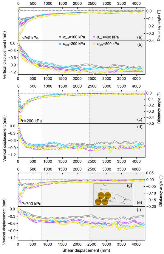 Vertical displacement and dilatancy angle versus shear displacement under different suction conditions: (a) Dilatancy angle for = 0 kPa; (b) Vertical displacement for = 0 kPa; (c) Dilatancy angle for = 200 kPa; (d) Vertical displacement for = 200 kPa; (e) Dilatancy angle for = 700 kPa; (f) Vertical displacement for = 700 kPa; (g) Schematic illustration of the dilatancy angle calculation.