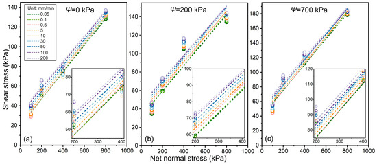 This study employed the dual-parameter Coulomb law to fit residual strength envelopes under different suction conditions using the least-squares method (Figure 8). The intercept of the strength envelope along the axis represents the residual cohesion (), characterizing interparticle adhesion and structural connection strength, while the slope corresponds to , where is the residual internal friction angle representing particle sliding friction resistance. Figure 8a–c present the residual strength envelopes for saturated ( = 0 kPa), medium-suction ( = 200 kPa), and high-suction ( = 700 kPa) conditions, respectively, with each group containing test results from nine shear rates ( = 0.05–200 mm/min). Furthermore, the residual shear strength generally shows a slight increase with increasing under different conditions. However, the variation patterns of shear strength are not consistent across different levels, which will be discussed in detail in the following section.